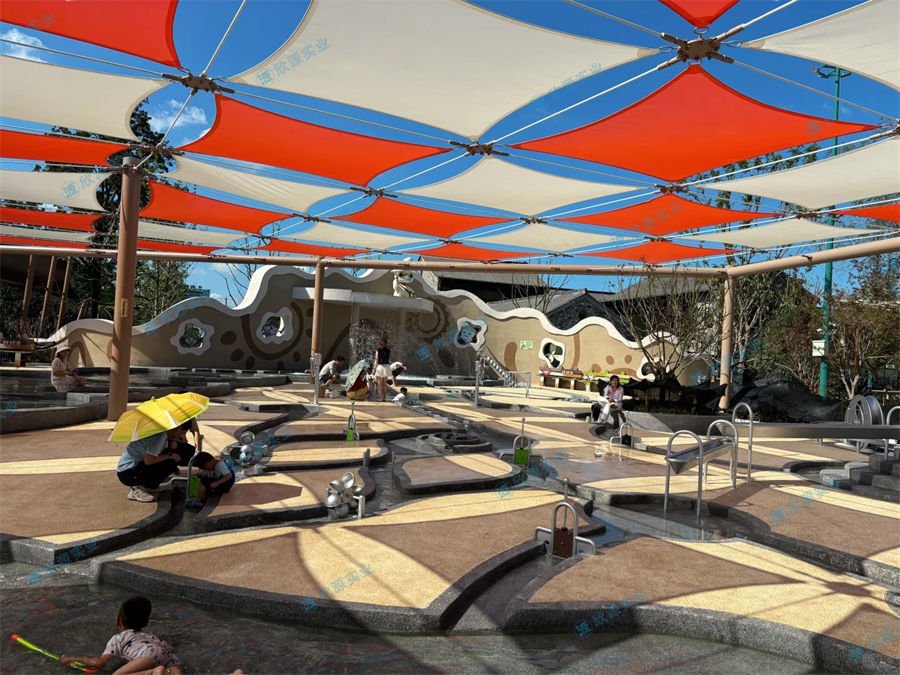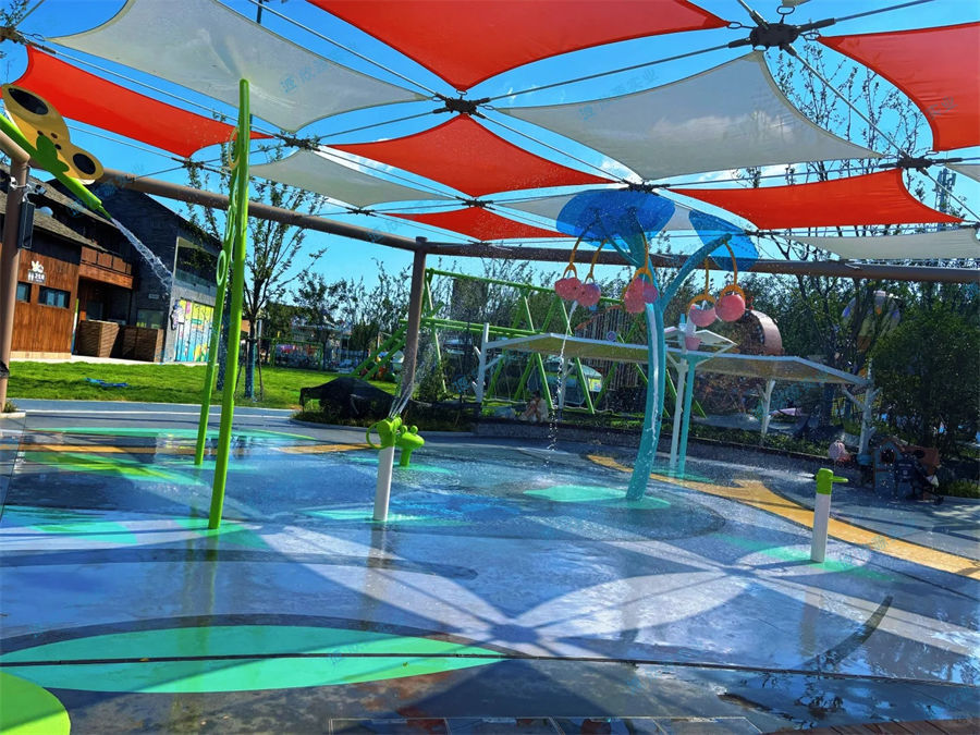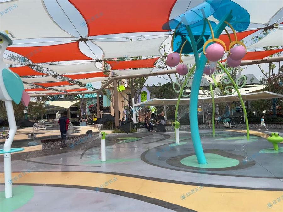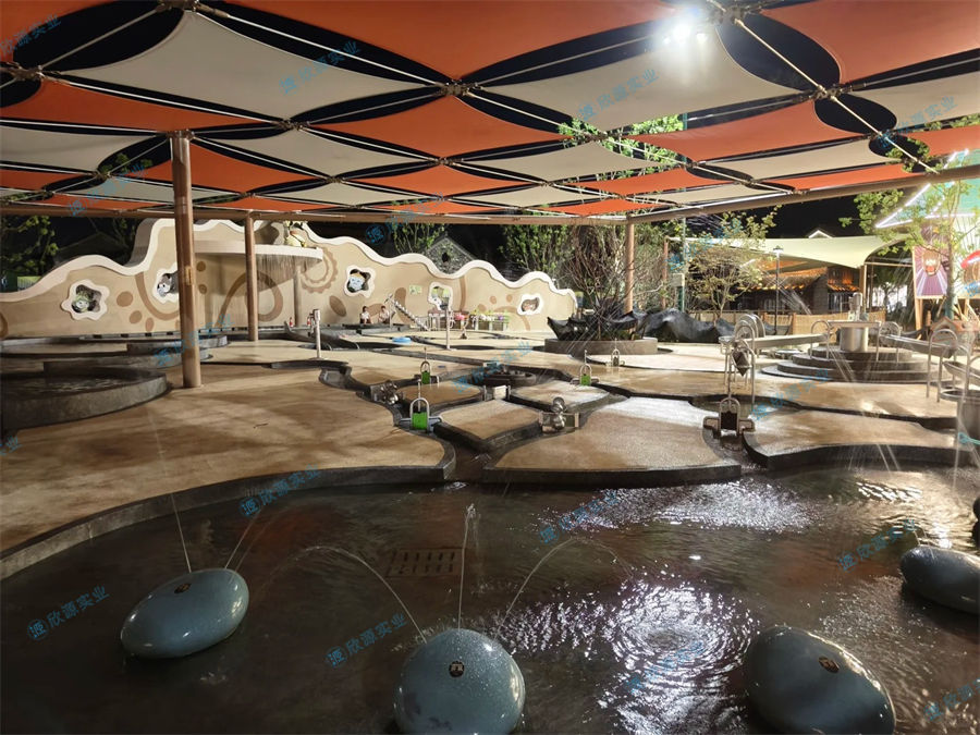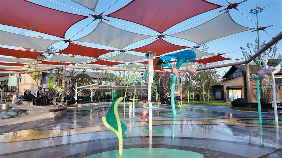 光合森林分區:以“植物生長”為故事線,配置迷你攀爬網、低空鉆爬隧道等設備,高度控制在1.2-1.5米,專為3-6歲低齡兒童設計,淺水區戲水裝置采用緩流設計,確保安全的同時讓孩子感受水的靈動;